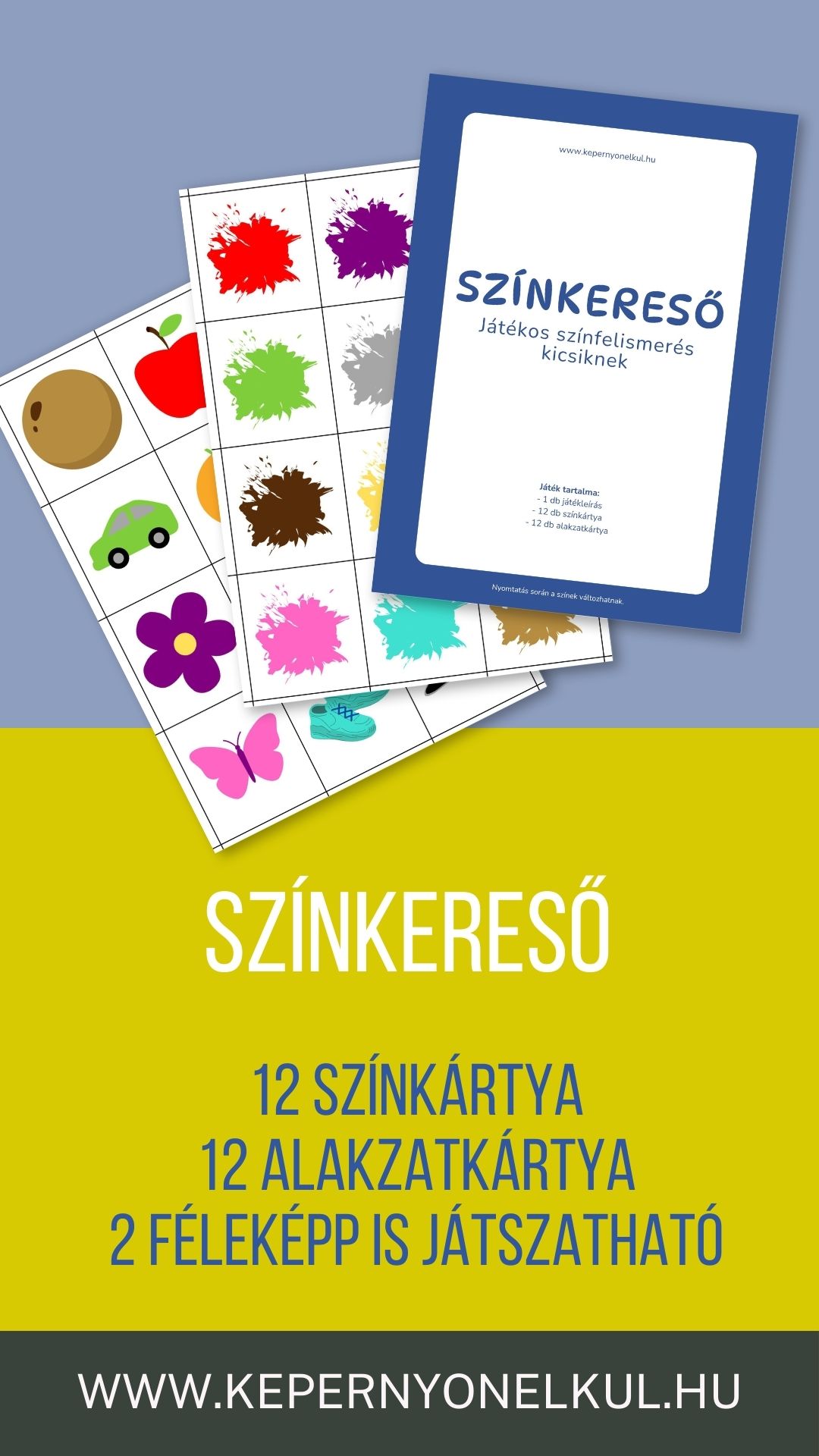 A Színkereső egy igazán pörgős, mégis egyszerű játék, amit pillanatok alatt elő tudtok venni. Kétoldalas nyomtatható játék, amely 12 színkártyát és 12 alakzatkártyát tartalmaz.
